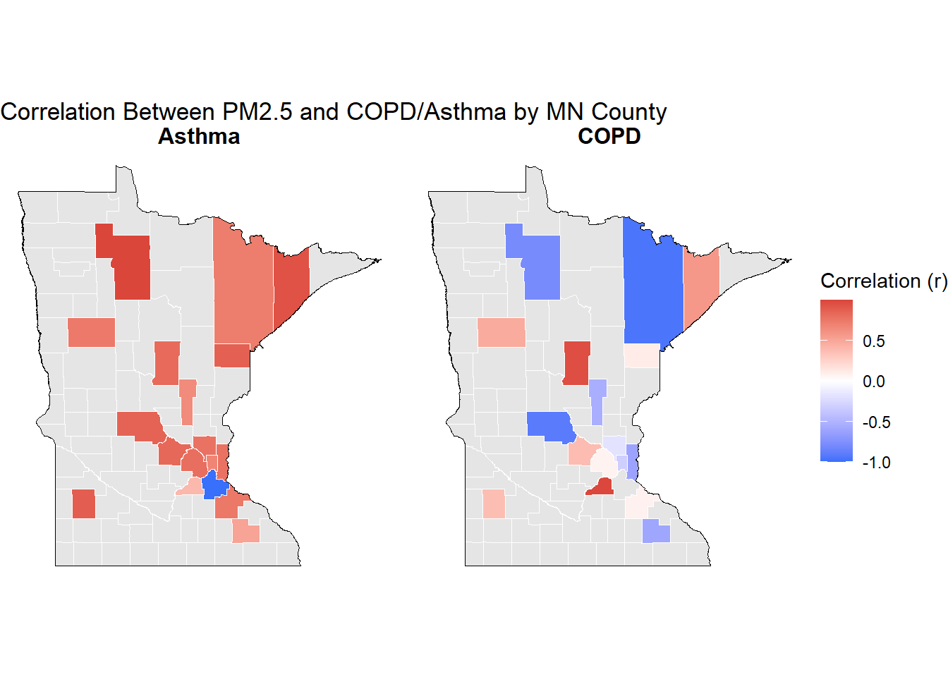 Analyzed >10,000 records of Minnesota Department of Health data on asthma, COPD, and air quality (PM2.5) using a custom SQL + R pipeline, producing county-level correlations (Pearson's r) and significance testing (p-value) results visualized through heatmaps and choropleth maps.